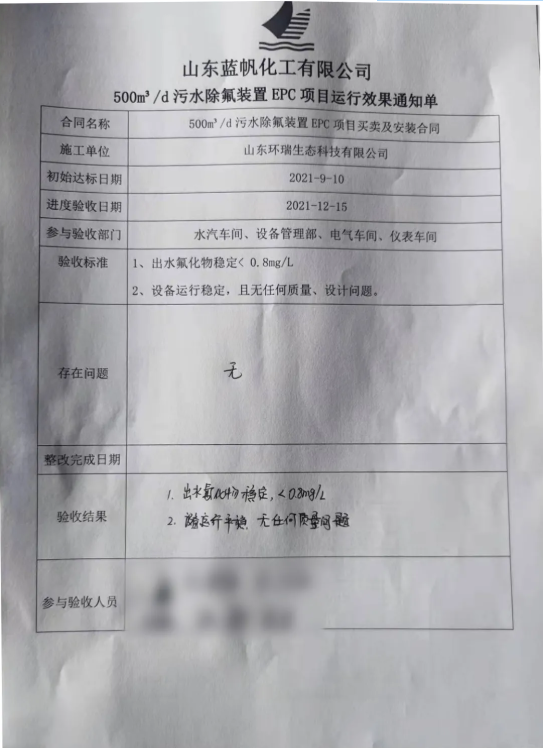 2021年12月15日,我司深度除氟<0.8mg/L項(xiàng)目——《藍(lán)帆化工煤造氣廢水深度除氟項(xiàng)目》順利通過(guò)竣工驗(yàn)收!